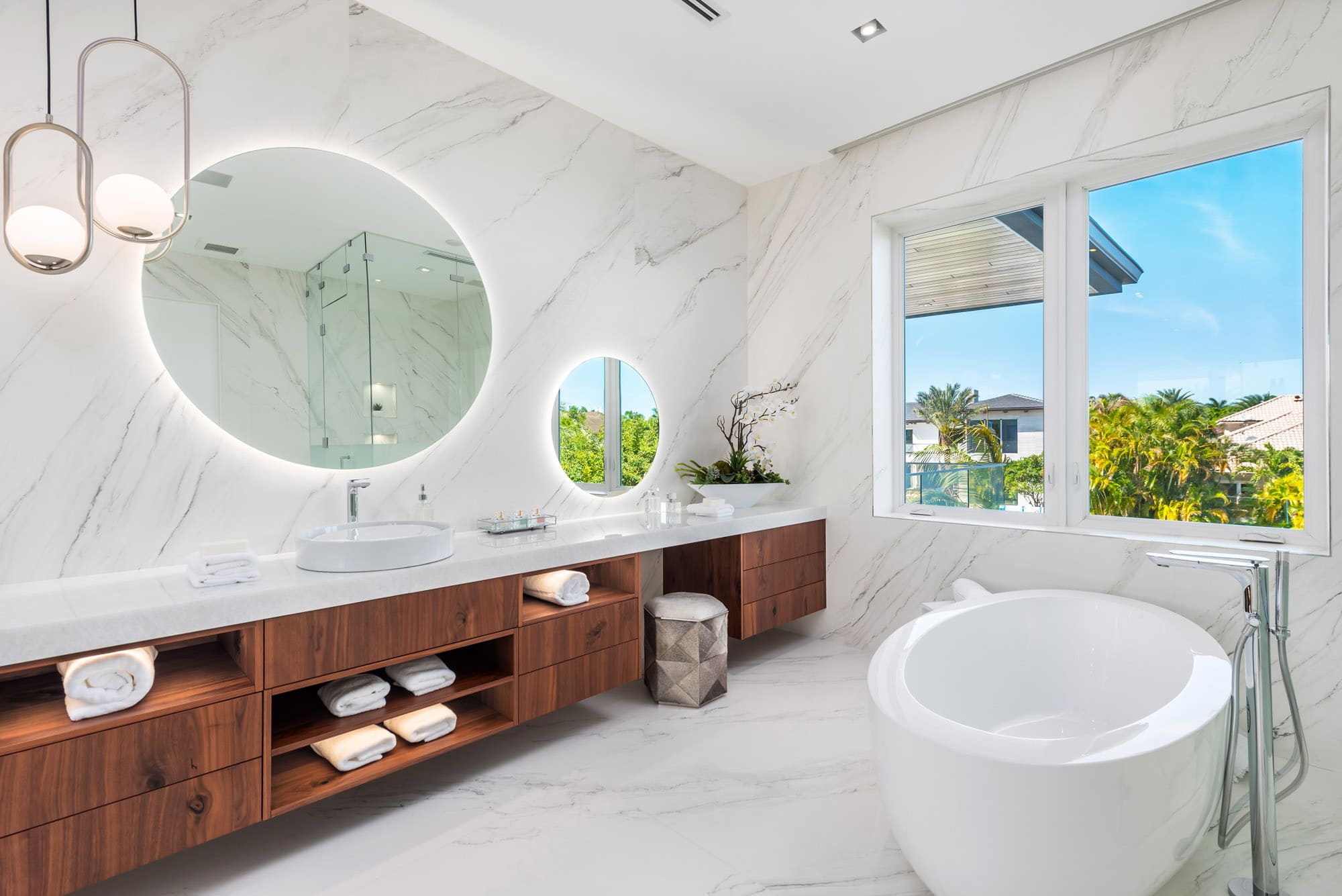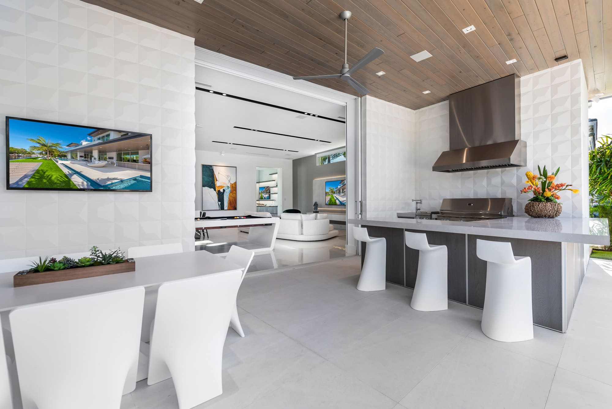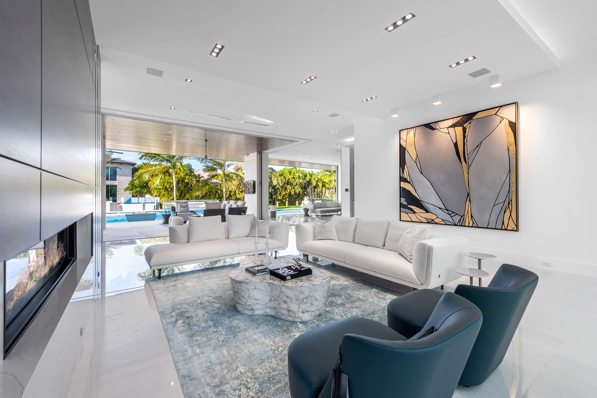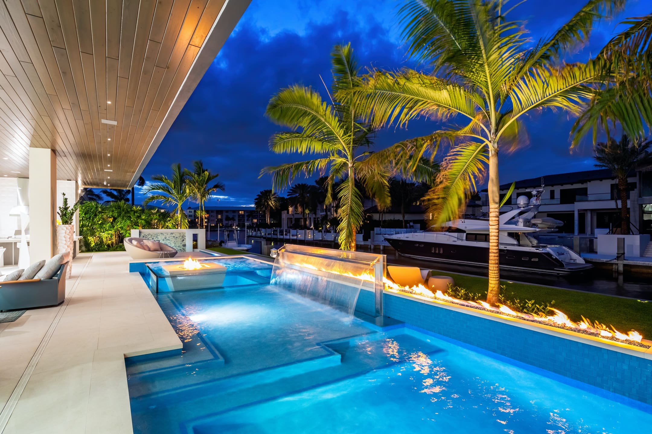 A striking contemporary waterfront estate defined by clean architectural lines, expansive glass, and seamless indoor–outdoor living. A dramatic glass elevator, a stunning water-feature entry with an architectural bridge, and illuminated pool fire features create a memorable arrival and a spectacular atmosphere at night. Warm natural wood finishes, sculptural lighting, and a refined neutral palette complete the home’s sophisticated modern design overlooking the water.